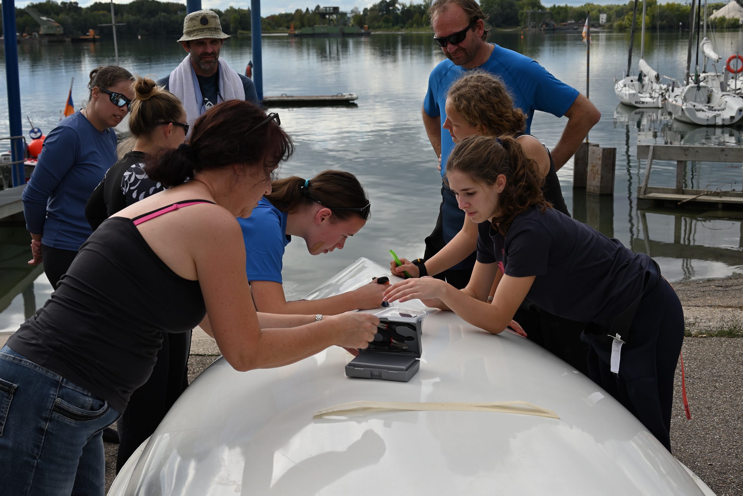 Die Herbstwindregatta in der 35. Auflage für die Europe- und Opti-Klasse fand bei wechselnden Wetterbedingungen am Goldkanal statt. Wenn auch das Wetter etwas freundlicher war als die garstig kalten und regnerischen Tagen zuvor, ließ der Wind am Samstag auf sich warten. Es wurden Boote getrimmt und geputzt, gefachsimpelt und und und, aber leider nicht gesegelt. Zumindest die Opti-Kinder hatten ihren Badespaß.